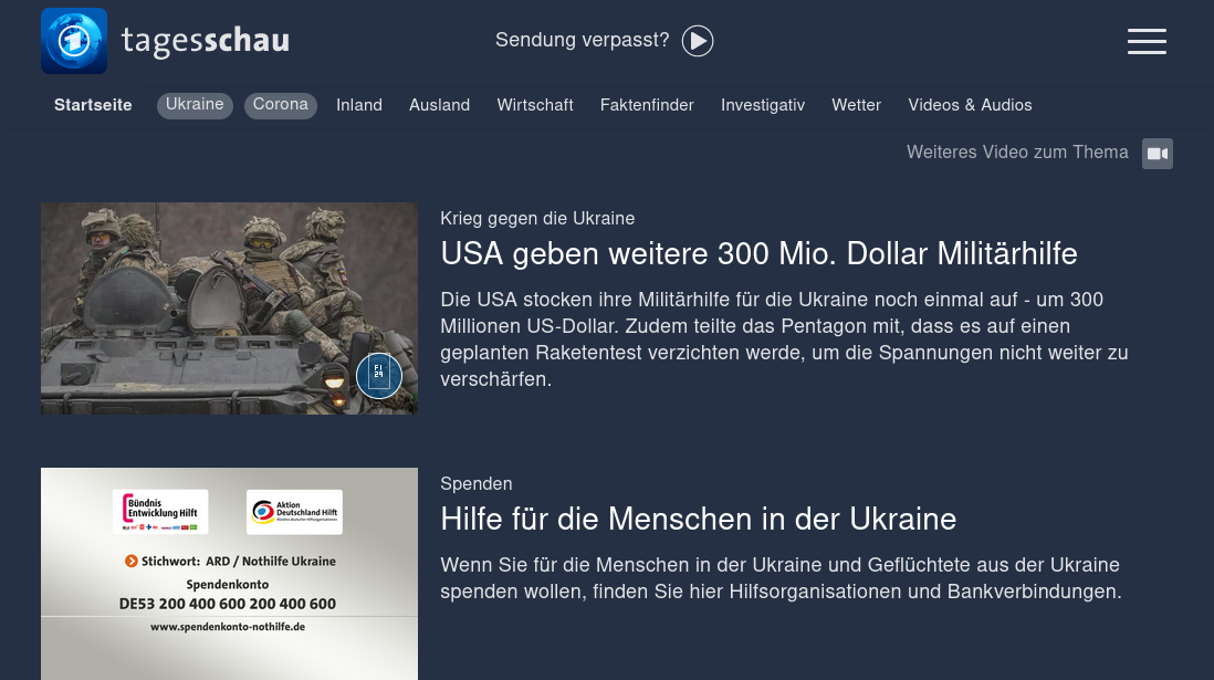 intelligenter mensch 2. April 2022 02.04.2022 Der Mensch, das vernunftbegabte Wesen... <img src=/assets/images/20220402_intelligenter_mensch.png alt=”Tagesschau.de, 2 Artigel untereinander, der eine meldet 300 Milliarden zusätzliche Militähilfe der USA, der darunter fordert zum Spenden für die Menschen in der Ukraine auf”> ← Sonnenaufgang am Wattenmeer... Alle Beiträge Hallo halo →